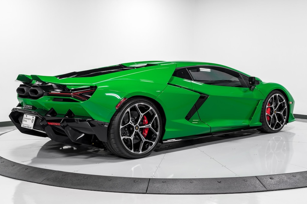 This is a 2024 Lamborghini Revuelto Coupe equipped with a 6.5L/814-hp/535-lb-ft DOHC 48-valve V-12, plus two 148-hp/258-lb-ft electric motor and one 148-hp, 111 lb-ft electric motor; combined 1001 hp and 739 lb-ft engine, an 8-speed Dual Clutch (auto & paddle shift) transmission with AWD and 4 wheel steering system. This Revuelto is finished in a gorgeous Verde Viper (Gloss Green) exterior color and Nero Cosmus (Black) full leather interior along with contrast stitching throughout.
