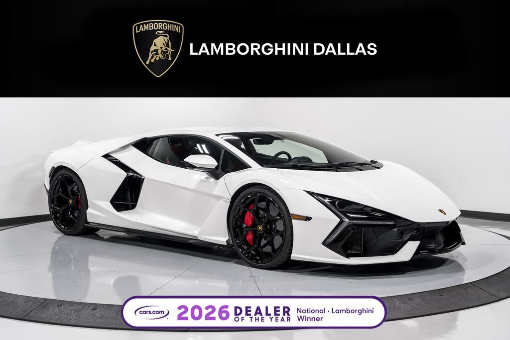 This is a 2025 Lamborghini Revuelto Coupe equipped with a 6.5L/814-hp/535-lb-ft DOHC 48-valve V-12, plus two 148-hp/258-lb-ft electric motor and one 148-hp, 111 lb-ft electric motor; combined 1001 hp and 739 lb-ft engine, an 8-speed Dual Clutch (auto & paddle shift) transmission with AWD and 4 wheel steering system. This Revuelto is finished in a gorgeous Bianco Monocerus (White) exterior color and Nero Ade (Black) full leather interior along with contrast stitching throughout.