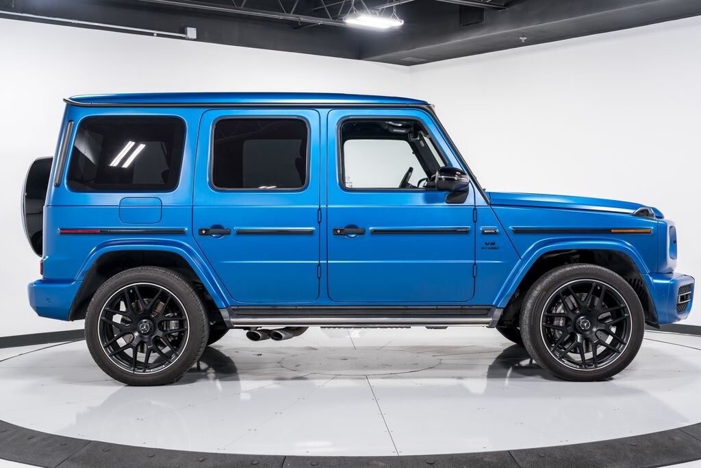 This is a smoke-free Carfax certified 2021 Mercedes-Benz AMG G63 equipped with a 4.0L Twin Turbo V8 engine and an 9-speed AMG automatic with sport shift transmission and AWD. This car is finished in a beautiful South Sea Blue Metallic exterior color and Espresso Brown/Black Exclusive Nappa Leather (Designo) interior.