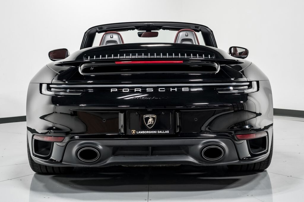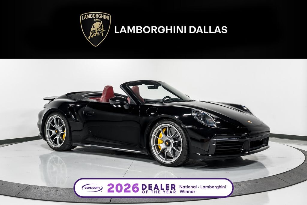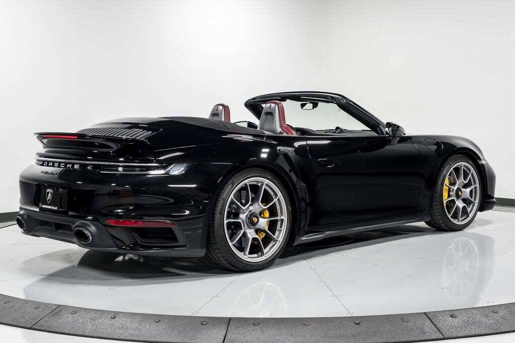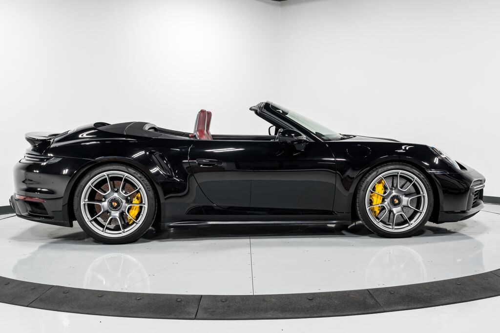 This is a Carfax certified 2021 Porsche 911 Turbo S Cabriolet equipped with a 3.8L 640HP H6 Turbo engine and a 7-Speed PDK transmission with AWD. This car is finished in an elegant Black exterior color, Black Top and Black/Bordeaux Red leather Interior.