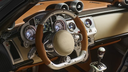 The steering wheel is the very symbol of a car; that of the Utopia is a symbol of Pagani's savoir-faire. No one had ever designed a steering wheel quite like this. In appearance it looks almost ordinary: one immediately notices, however, the excellent grip of the thick rim, finished with leather pads. But it is in the detail that its uniqueness is revealed: a closer look shows that the rim, spokes, and hub are a single piece of lightweight metal. Starting from a 43-kilo (94,80 lb) block, a five-axis milling machine works continuously for 28 hours to achieve this extraordinary object weighing only 1.6 kg (3.53 lb), the discarded waste being reused as recycled material for other industries. An expert craftsman hand-finishes, personally polishes, and carefully inspects each steering wheel. The result is an extraordinary feat of aesthetics and engineering.