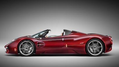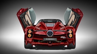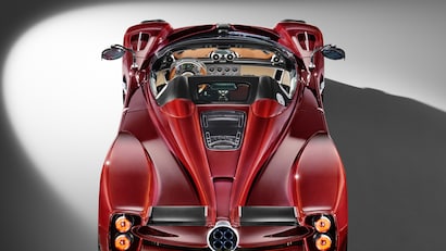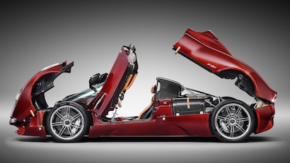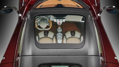 The styling of the two versions is an expression of continuity, being the work of the same team of designers and engineers; a team united by common visions, working under the guidance of Horacio Pagani in the Modenese Atelier. The doors have the same elegant butterfly kinematics, a fascinating and sophisticated mechanism. When one wishes to travel under the open sky, the hard-top can be placed on a stand, transforming it into a piece of design to be looked at and admired. In addition to this, there is a soft-top, which can be stored in a suitcase in place of the vanity case that is usually located centrally behind the two seats. The same car can therefore convert into three different versions, each to be preferred depending on the season, the mood, the desire to feel enclosed and protected or in contact with the open air, and the wind gently caressing the face.